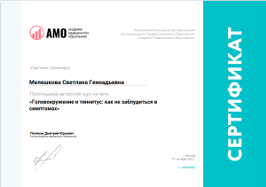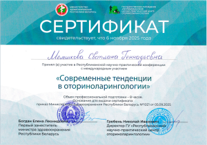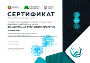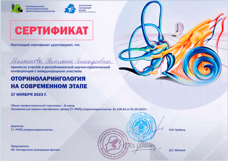 2023 г. — Повышение квалификации по программе «Инфекции верхних дыхательных путей и уха в детском возрасте» (для врачей-оториноларингологов), ГУО «БелМАПО».