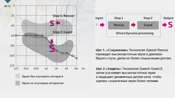 Данное изображение наглядно демонстрирует, что получает пациент от применения технологии Speech Rescue™ в слуховых аппаратах. Неслышимые пациентом высокочастотные звуки (шипящие согласные с, ф, ц, ш, щ, п) копируются в тот частотный диапазон, в котором слух пациента сохранен лучше, и усиливаются многократно.